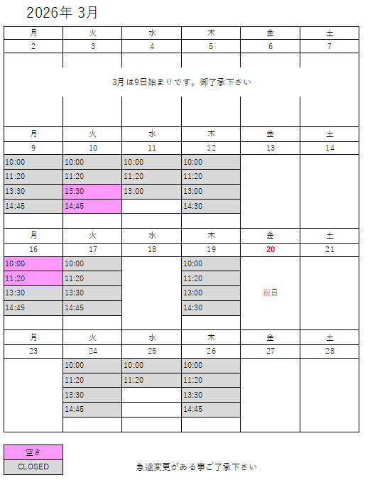 体験ご希望の方は下記カレンダーの空席状況のピンクの所から